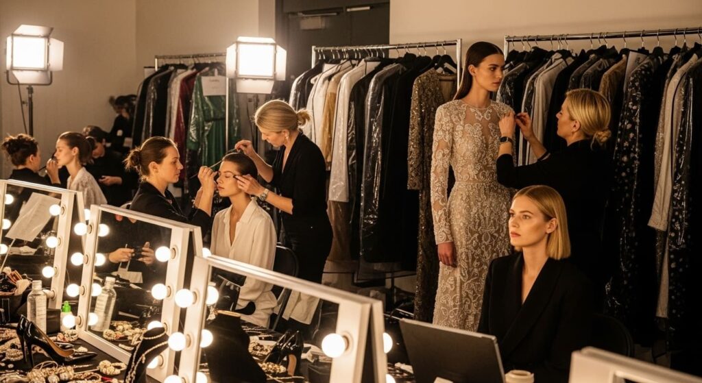 Behind the velvet curtains, the chaos was pure artistry. Hairstylists worked in synchronized chaos, makeup artists mixed palettes inspired by neon city lights, and designers whispered last-minute adjustments with nerves and pride.